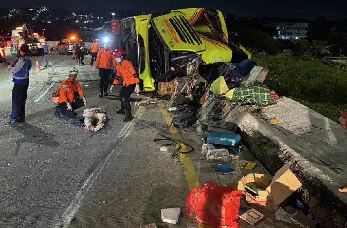 Arama kurtarma yetkilisi Budiono, şehirler arası 34 yolcu taşıyan otobüsün virajlı bir yolda devrildiğini, bazı yolcuların otobüs gövdesiyle bariyer arasında sıkıştığını belirtti.